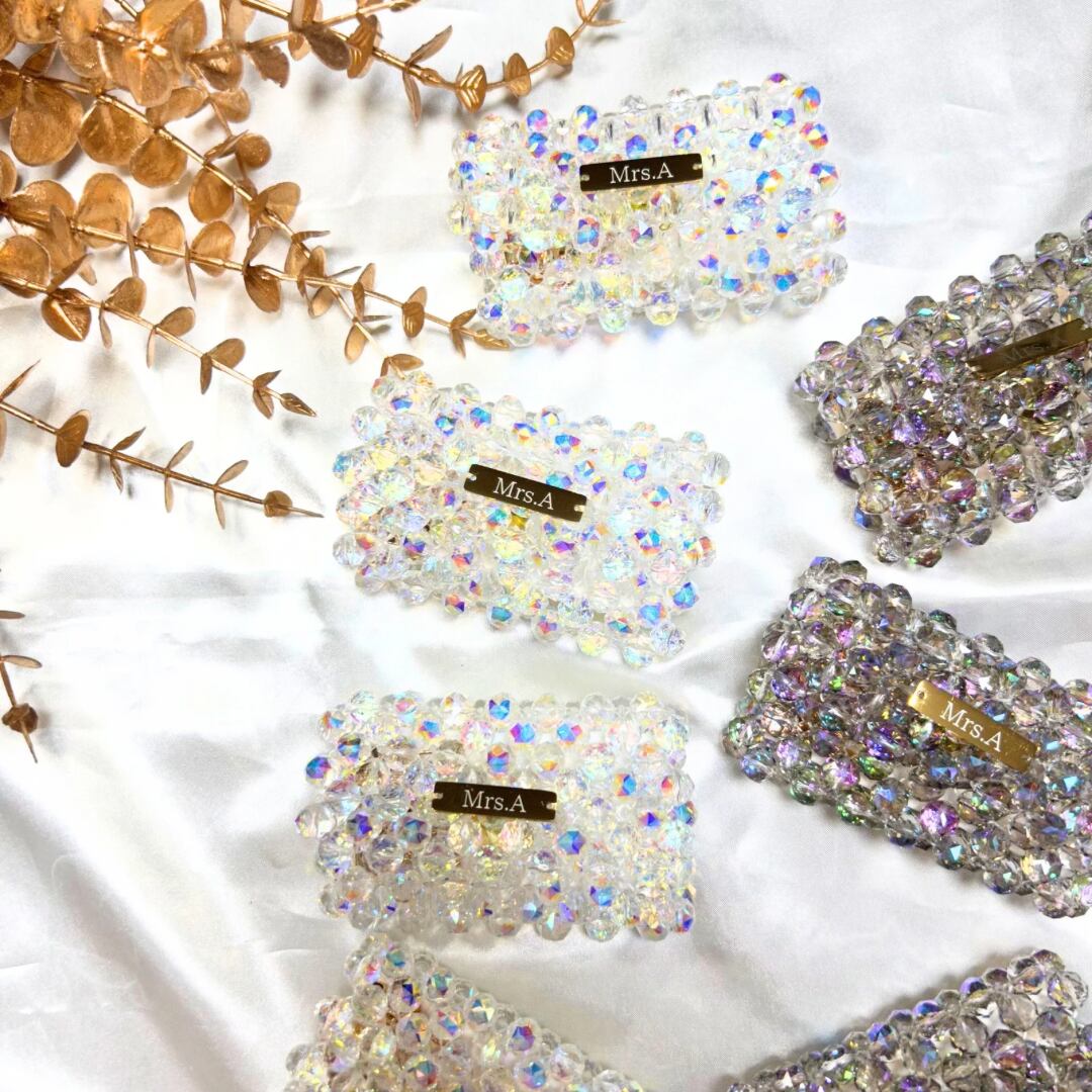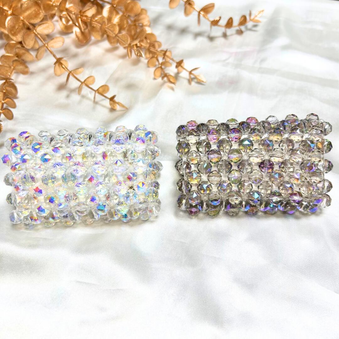 ガラスビーズを編み合わせ、内布はレザーサテン、マグネットボタンで仕上げております。
