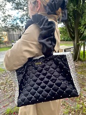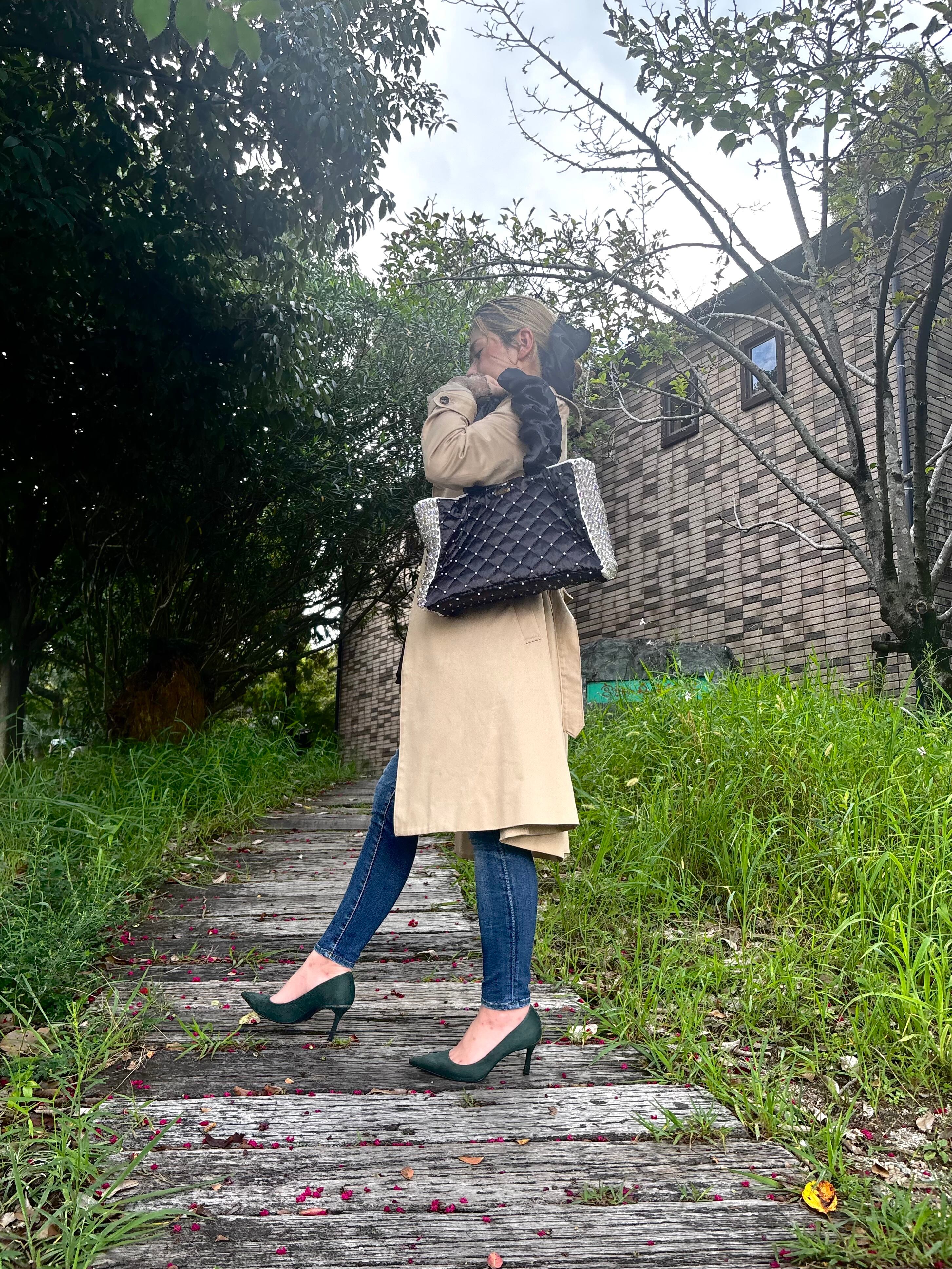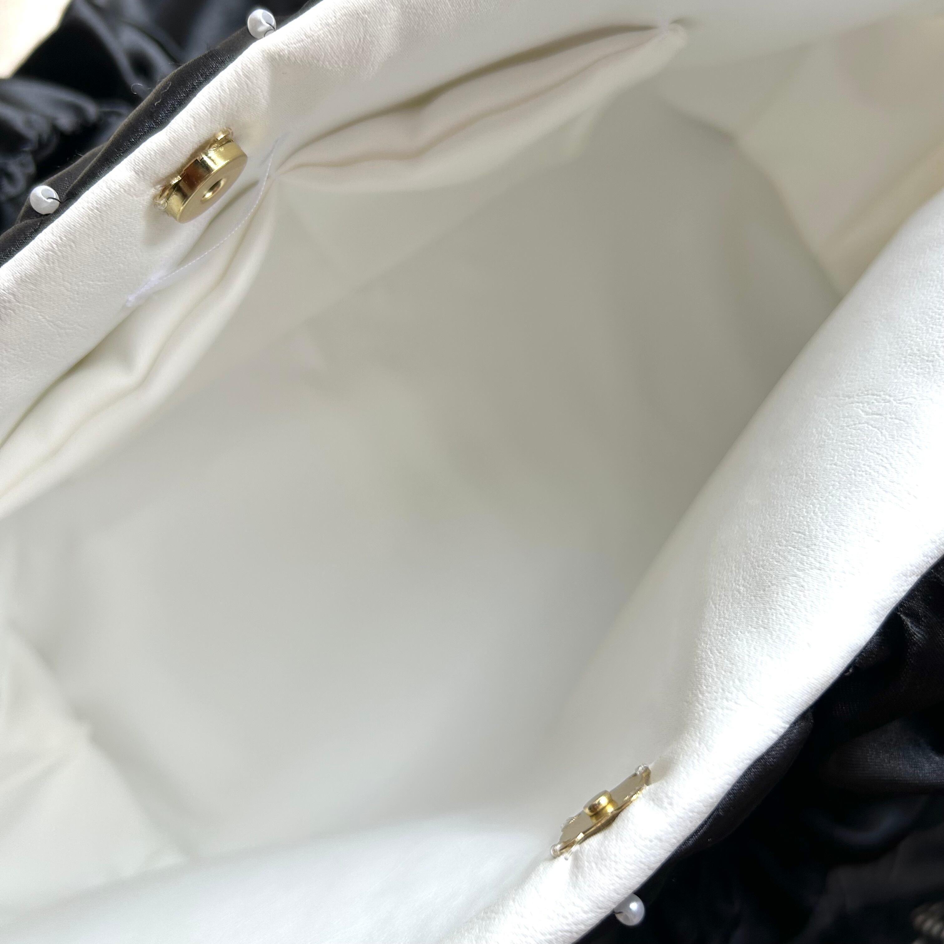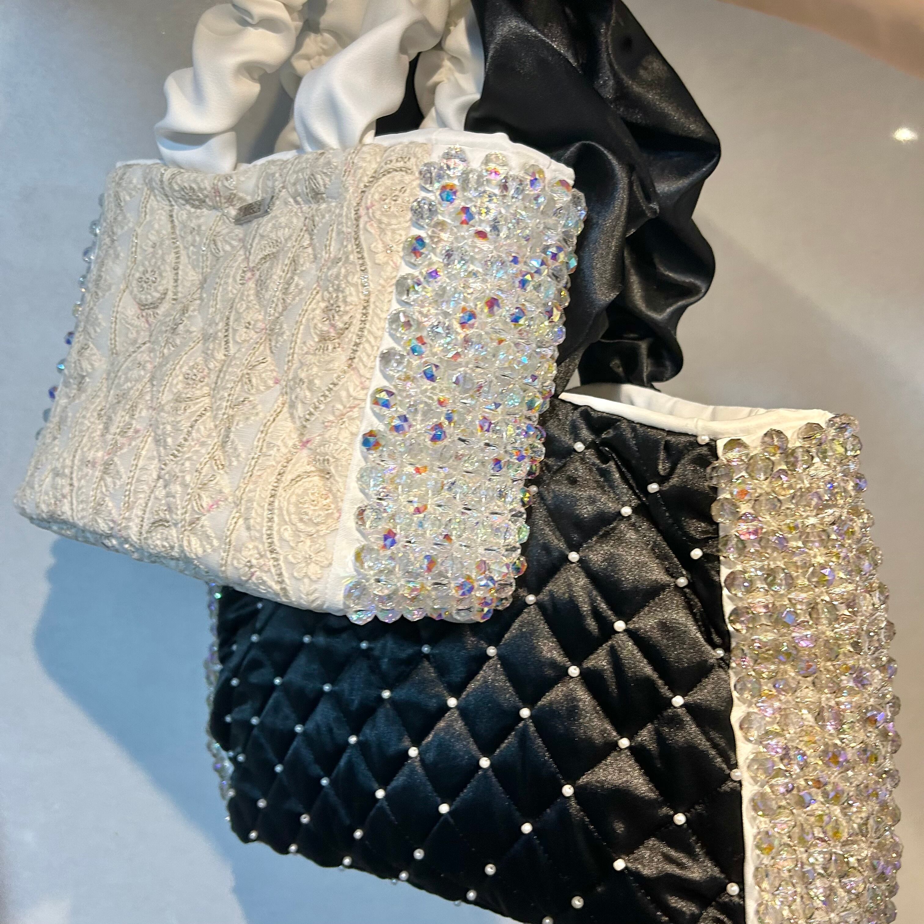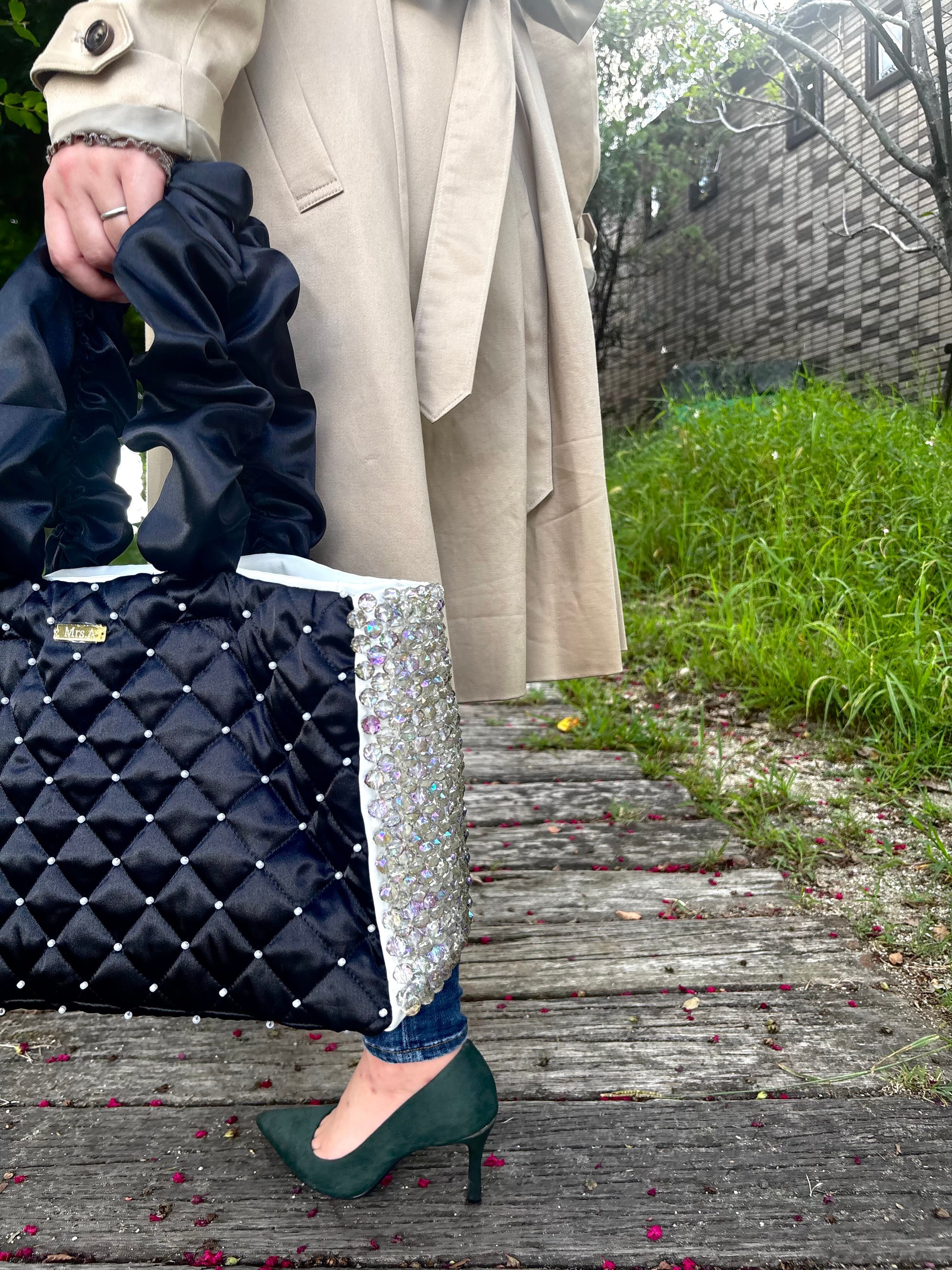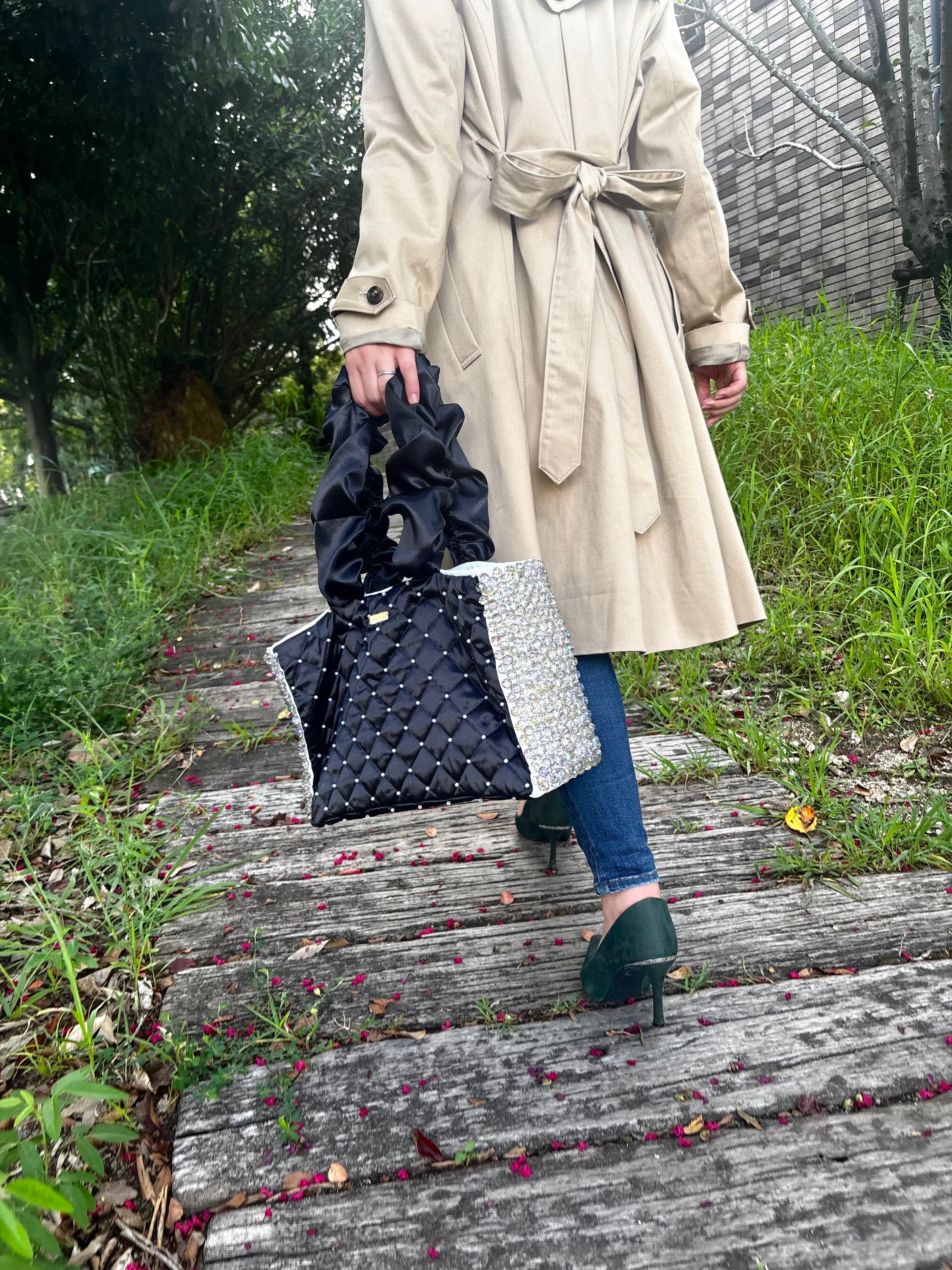 艶やかなブラックサテンにキルティングステッチを施し、きらめくパールとクリスタルを贅沢にあしらったラグジュアリーキルティングバッグ。